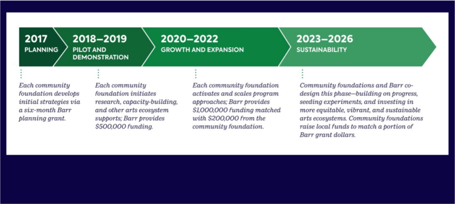 To achieve these outcomes, Creative Commonwealth has evolved into a ten-year initiative. An initial cohort of five community foundations began this journey with Barr in 2017; three additional community foundations joined the partnership in 2023.